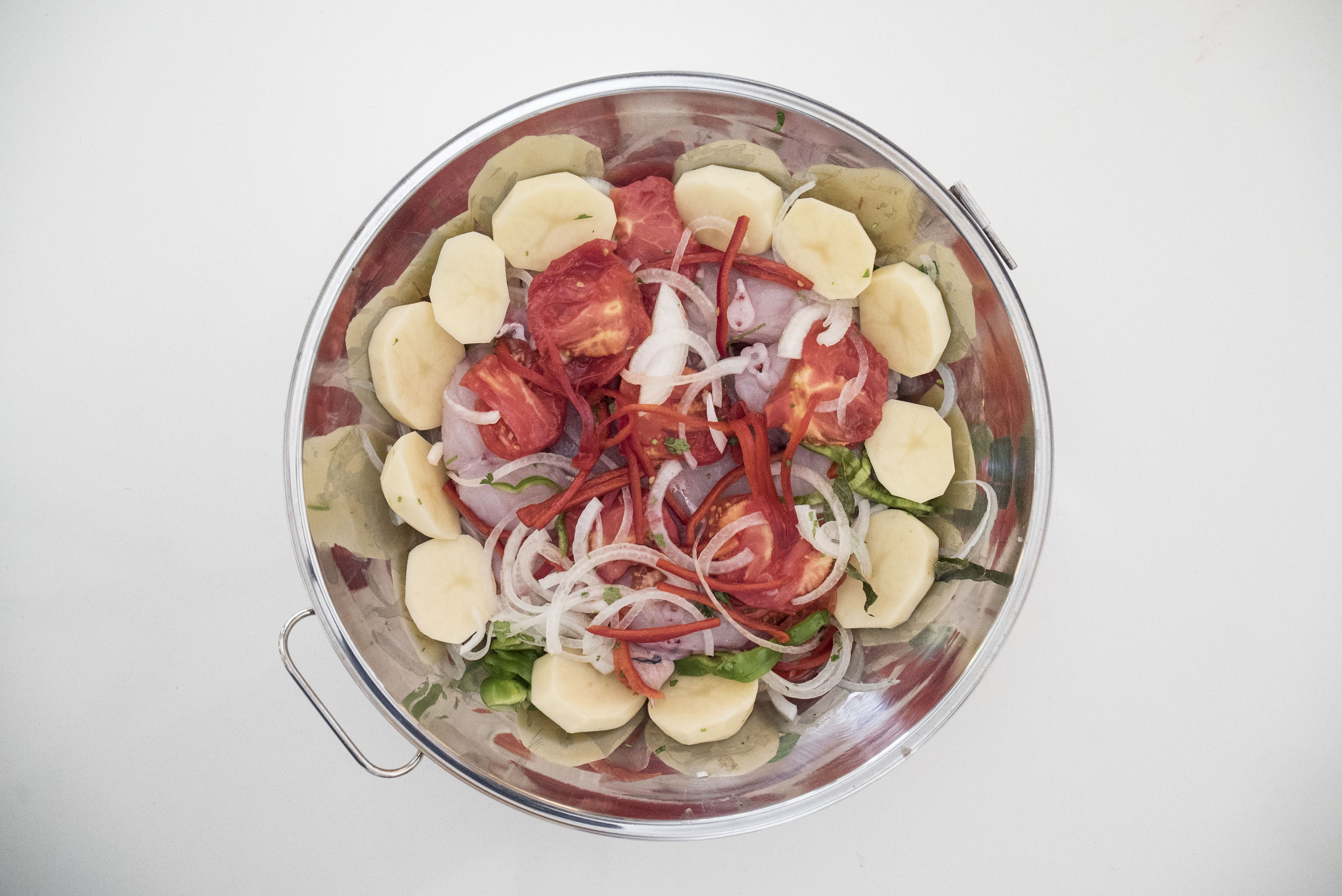 Dependendo do tamanho do tamboril, utilizam-se postas inteiras ou caso seja grande, meias postas, lavando-o bem antes da sua utilização. A crú, tira-se a casca aos camarões deixando a cabeça e o rabo. Picam-se os coentros.